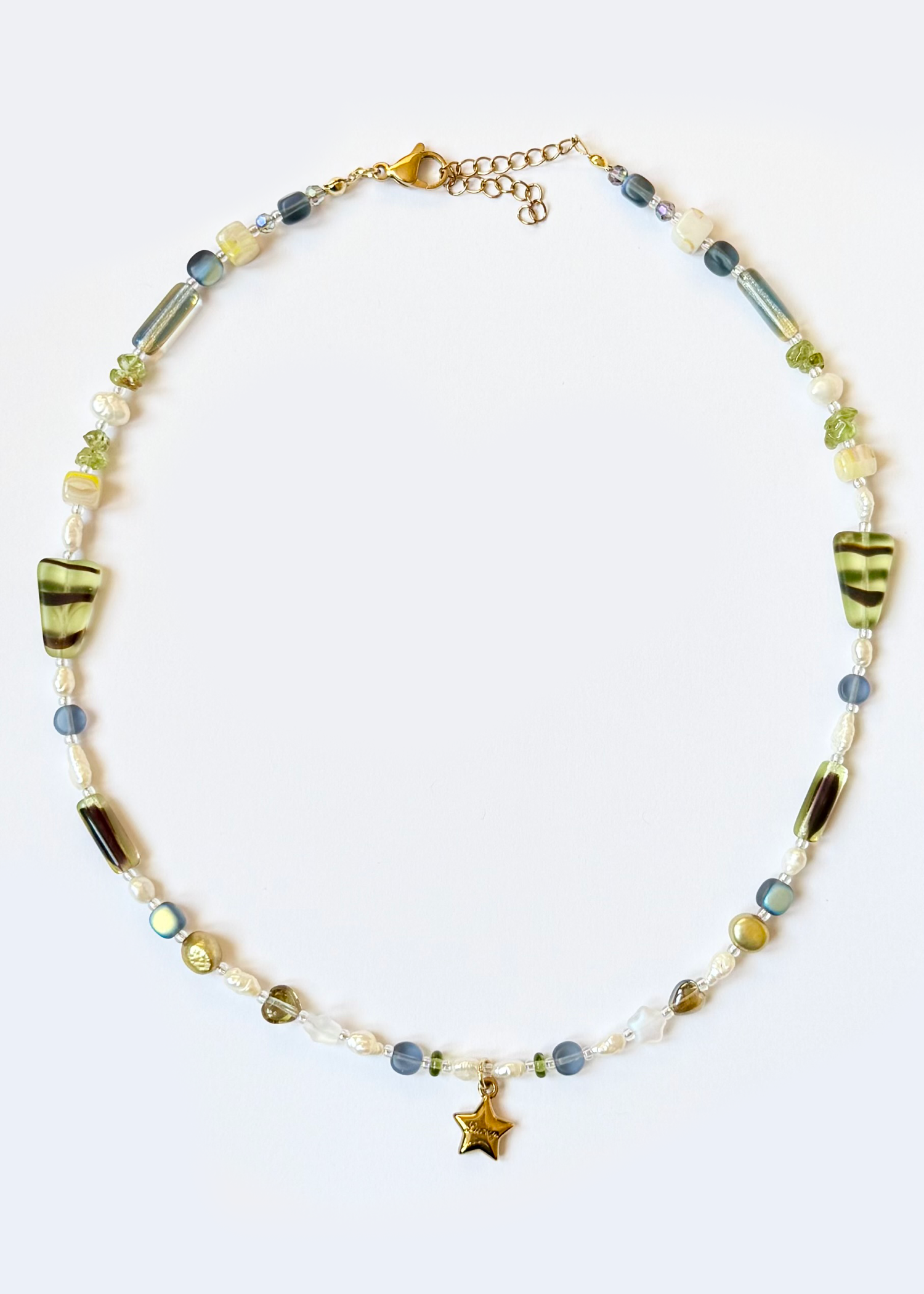glass & freshwater pearls with a stainless steel gold 'lucky' star charm, clasp and chain! only one available :-) 18-19.5 inches adjustable!